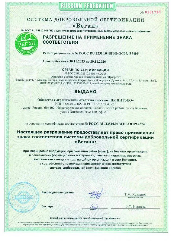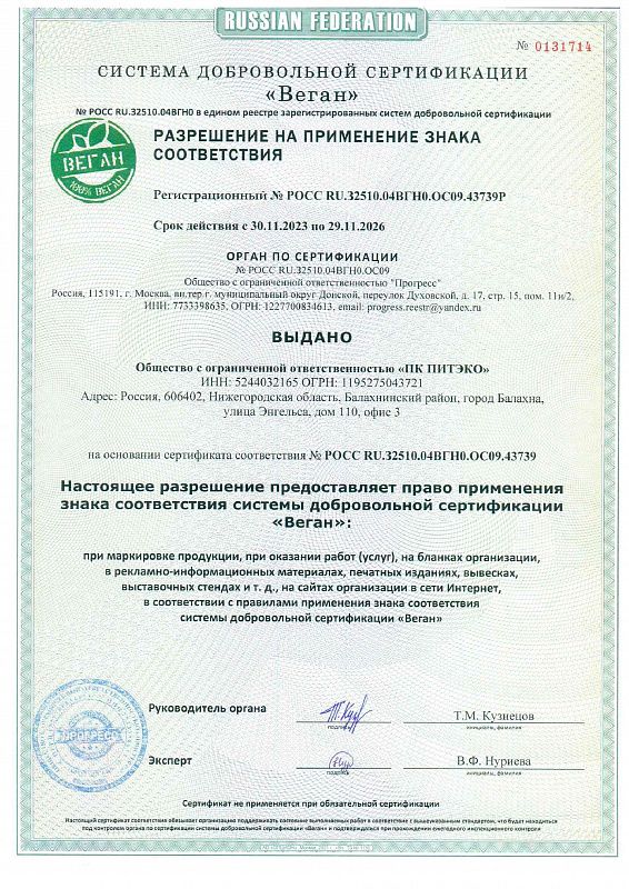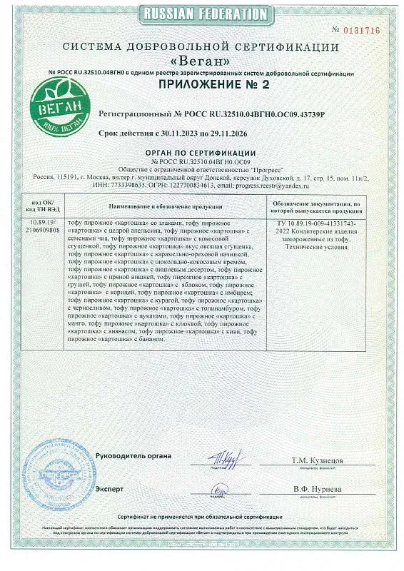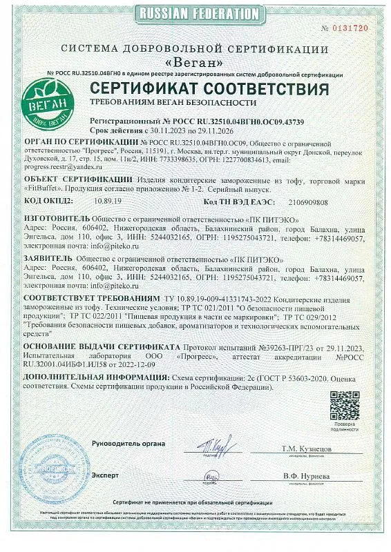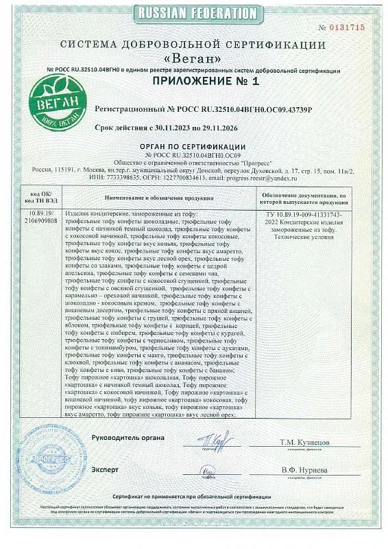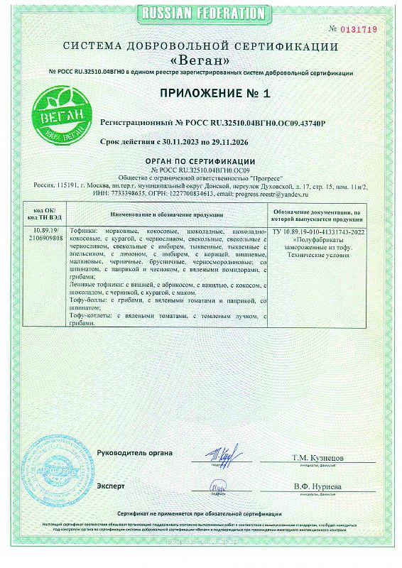 Главная Документация Документация Успешно проведенные клиниеские испытания ФГБУН "ФИЦ питания и биотехнологии" 1стр Успешно проведенные клиниеские испытания ФГБУН "ФИЦ питания и биотехнологии" 2стр Сертификат соответствия ВЕГАН Изделия кондитерские 1 Сертификат соответствия ВЕГАН Изделия кондитерские 2 Сертификат соответствия ВЕГАН Изделия кондитерские 3 Сертификат соответствия ВЕГАН Изделия кондитерские 4 ВЕГАН Полуфабрикаты замороженные Сертификат соответствия 2 ВЕГАН Полуфабрикаты замороженные Сертификат соответствия 3