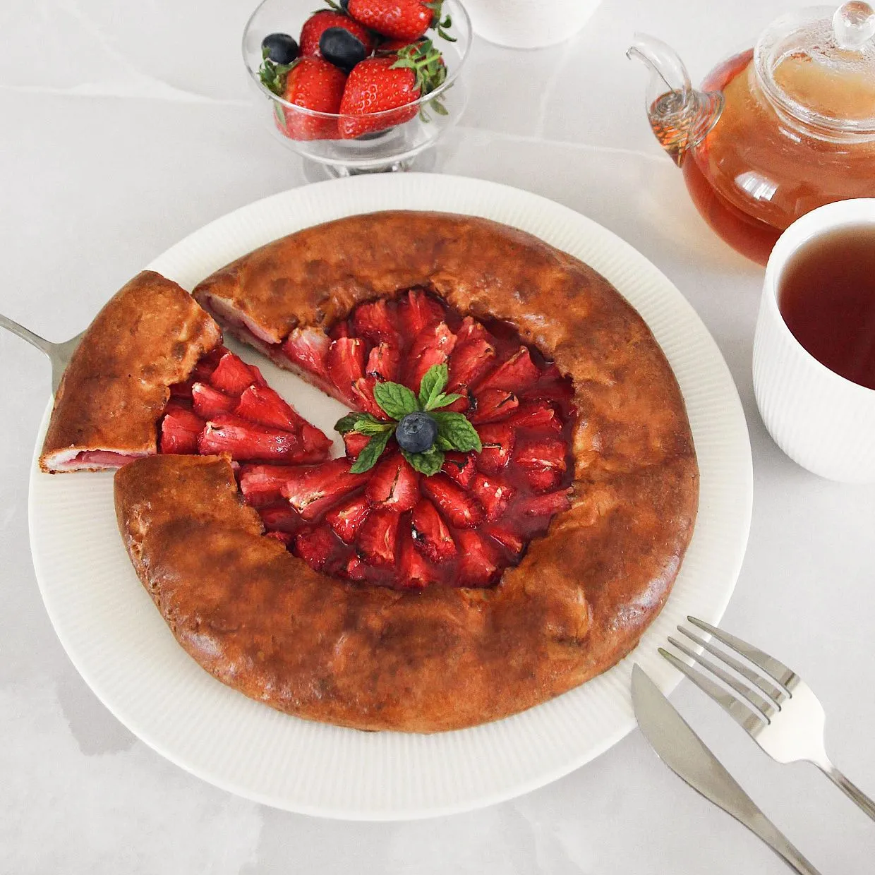 Нарезаем клубнику. Выкладываем на тесто по кругу двигаясь к центру, отступив 4 см от края.