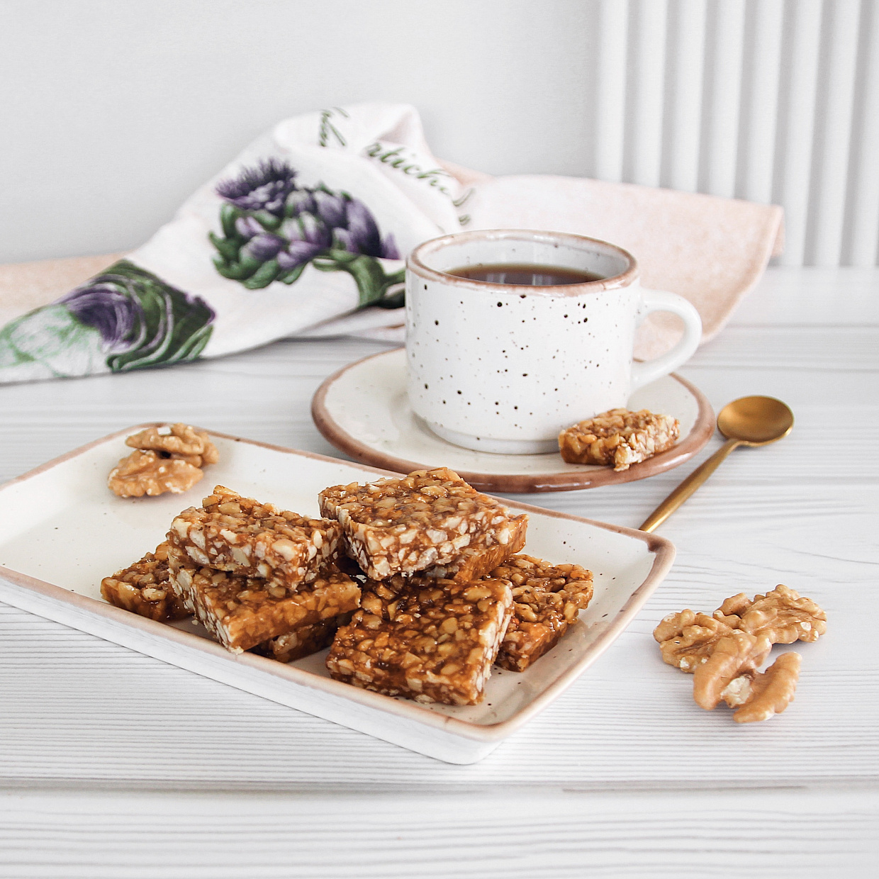 Как только сироп аллюлозы приобрел янтарный оттенок, добавляем орехи и перемешиваем лопаткой. Держим в сотейнике еще около минуты, помешивая лопаткой, и снимаем с огня.