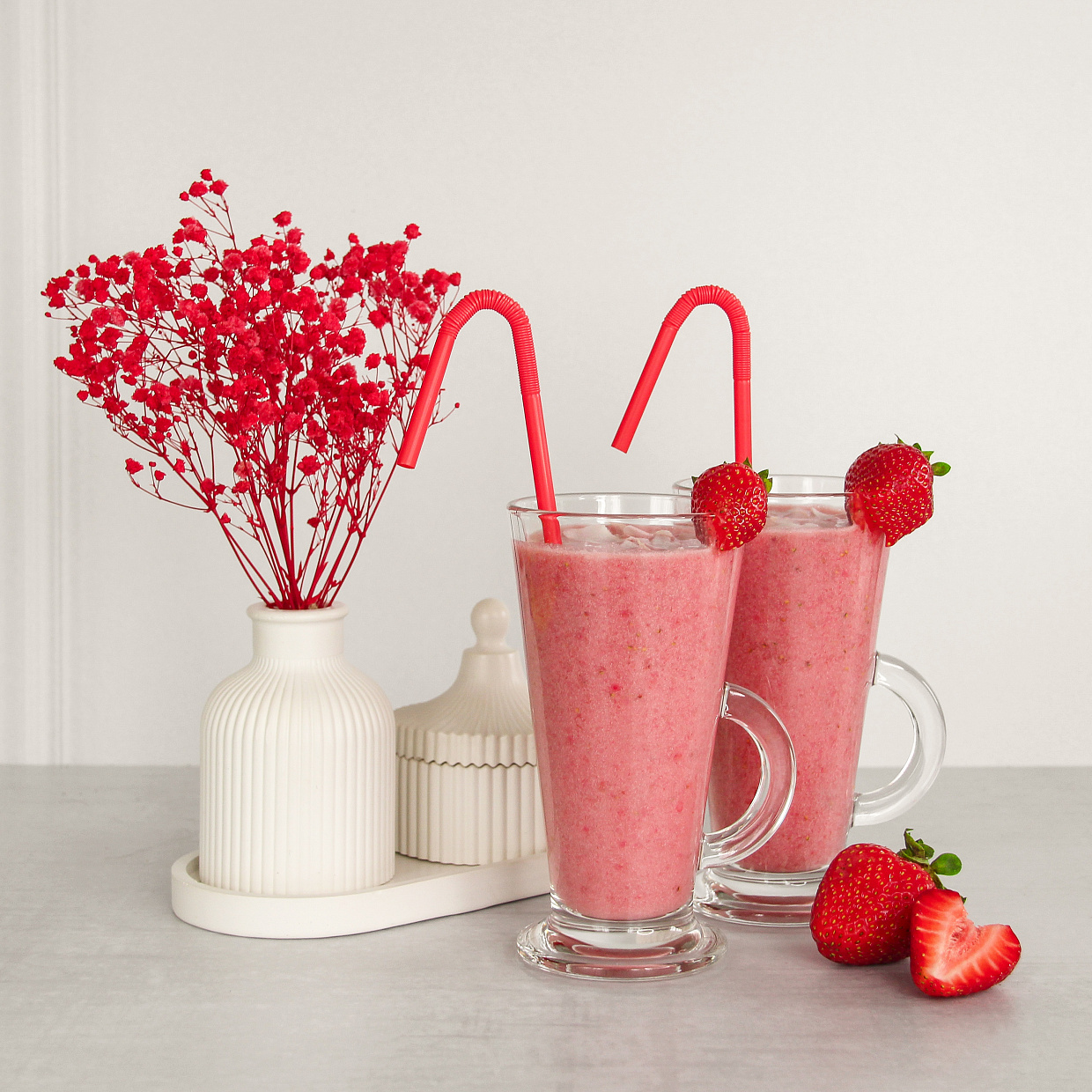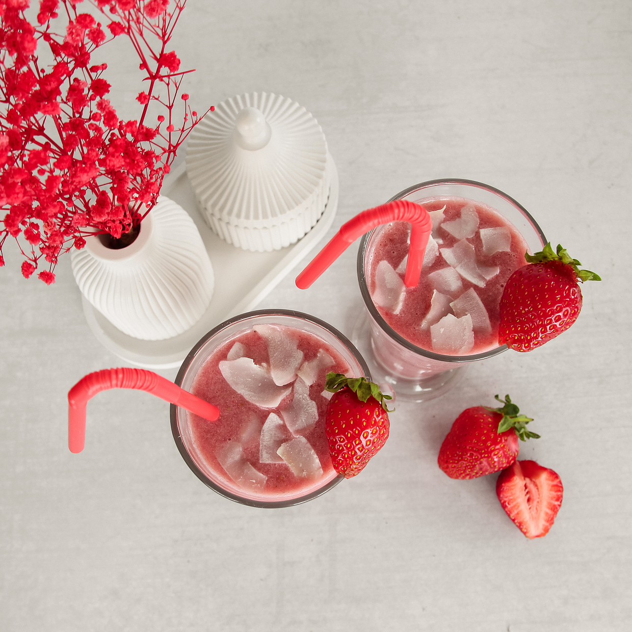 Разлить смузи по бокалам. Украсить клубникой, кокосовыми чипсами, листиком мяты.
