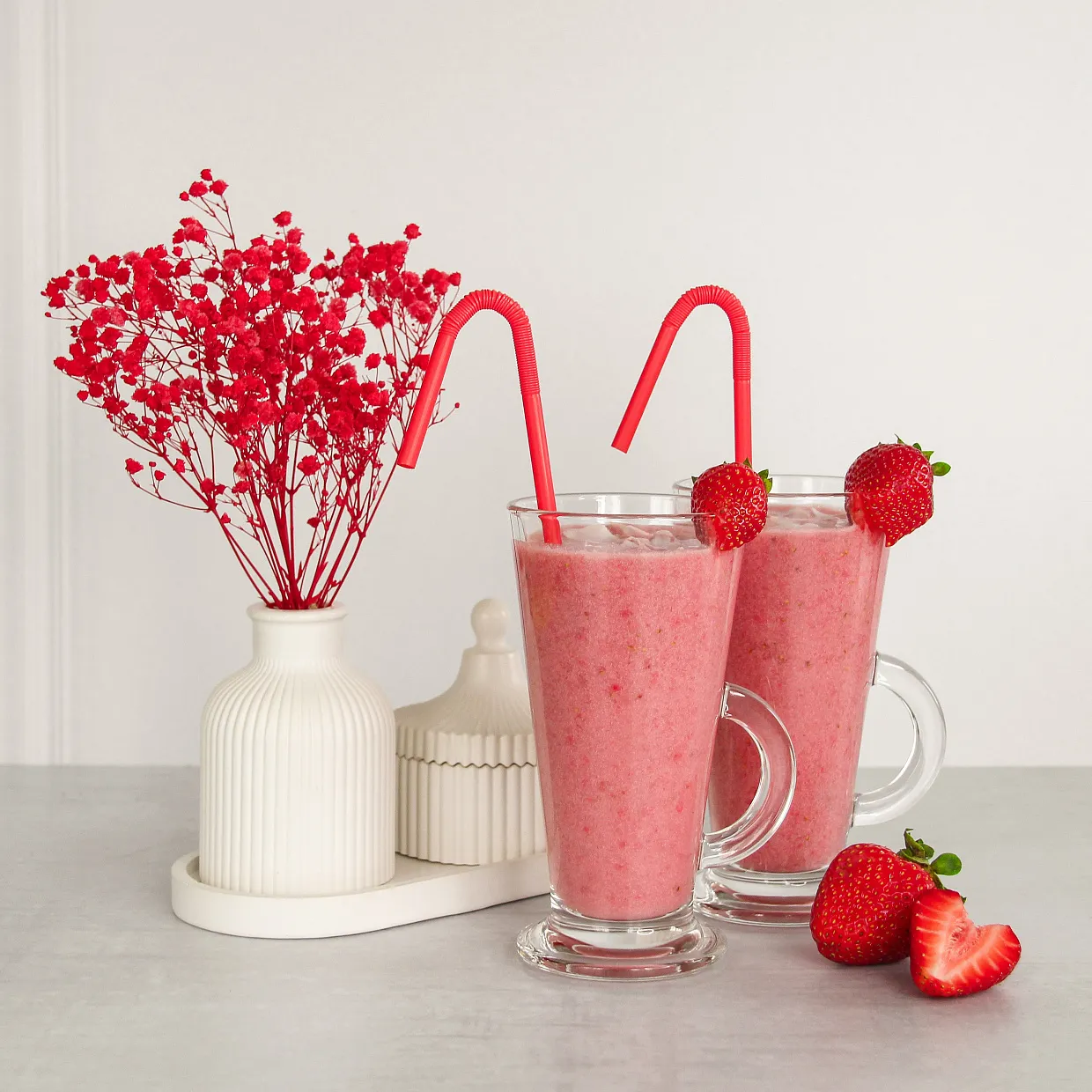 Разлить смузи по бокалам. Украсить клубникой, кокосовыми чипсами, листиком мяты.