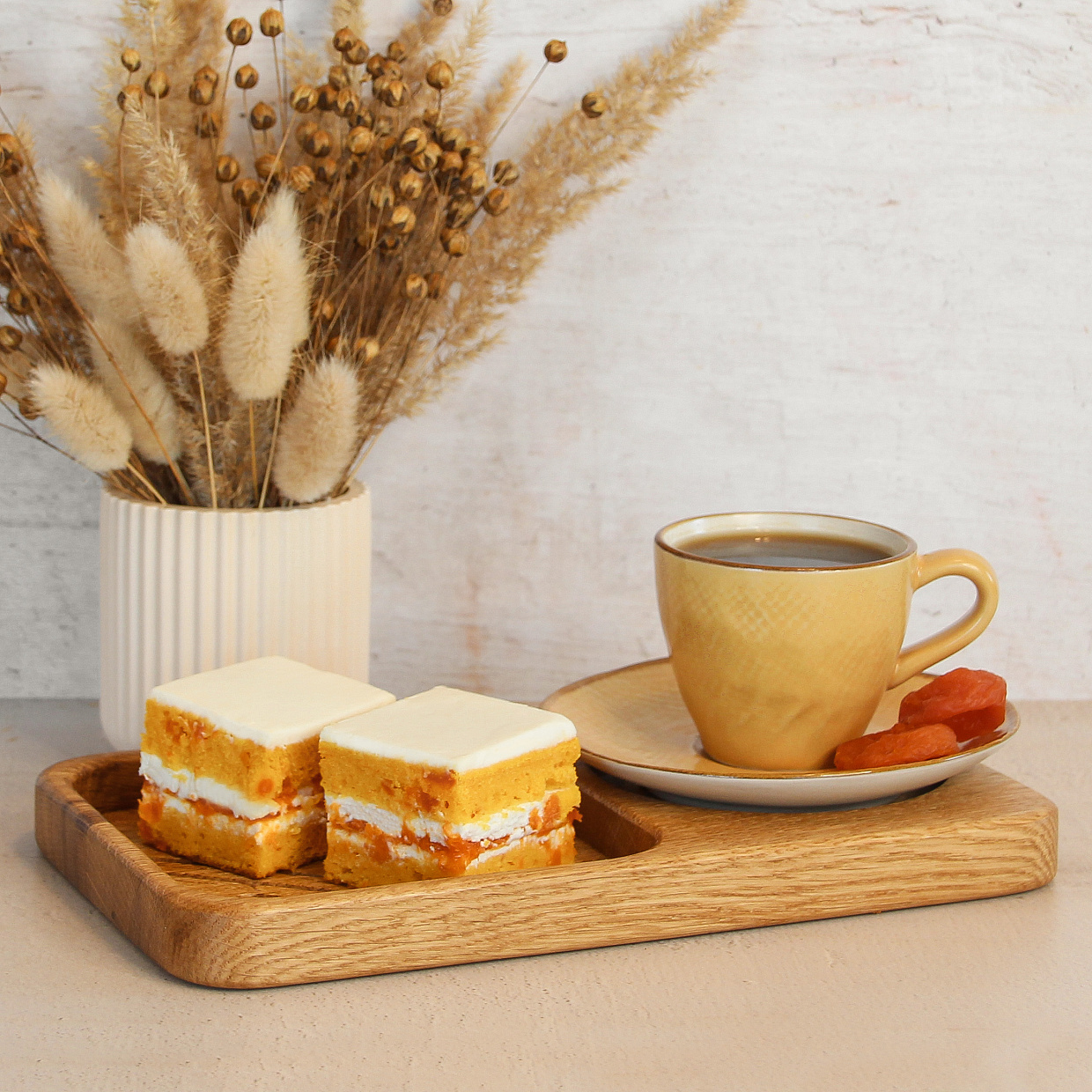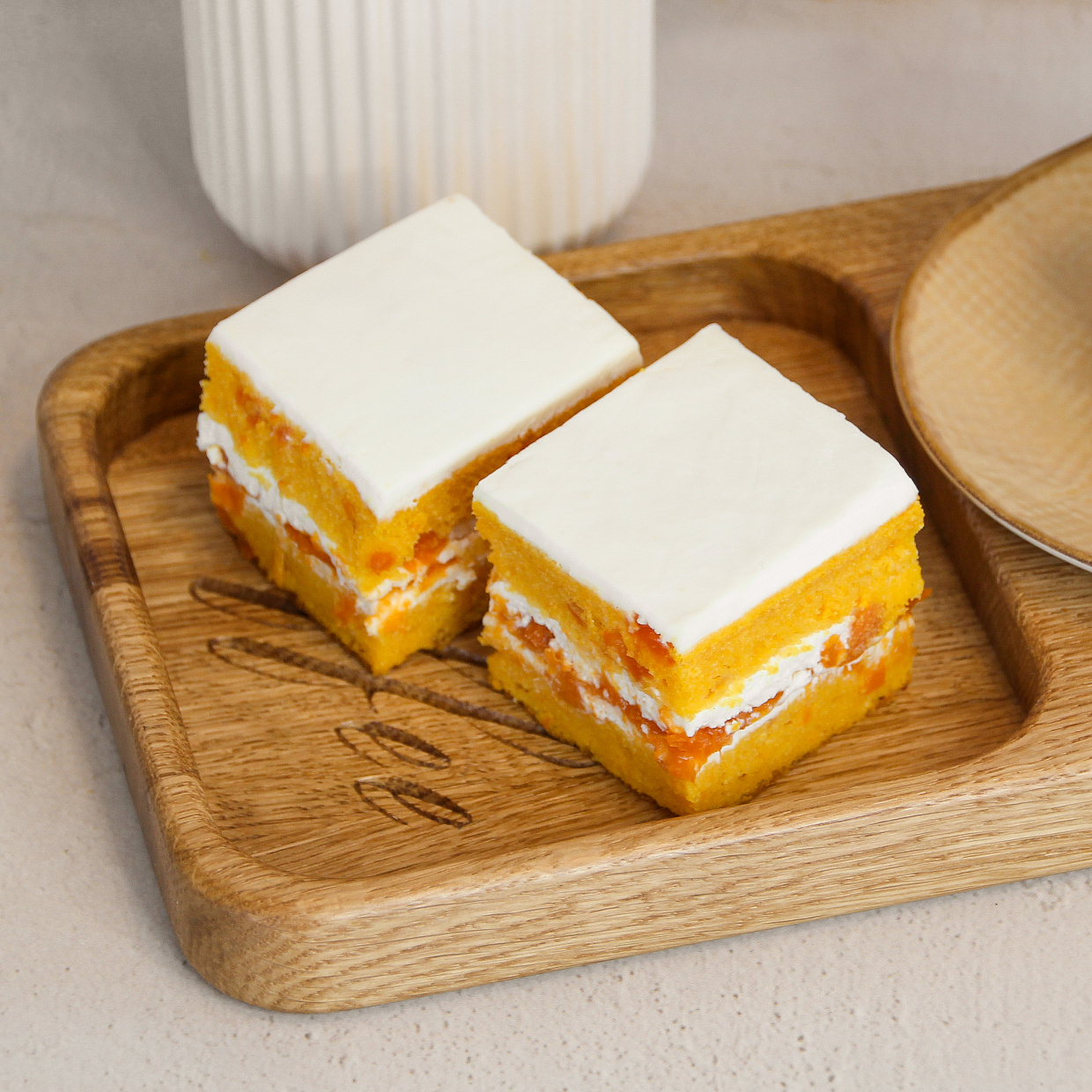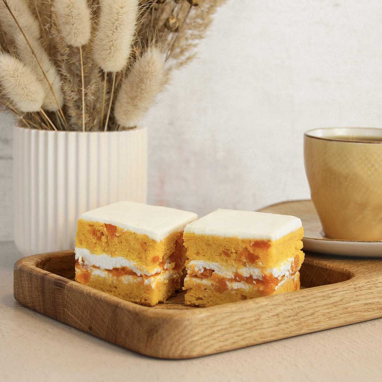 На второй корж также наносим и выравниваем творожный крем, по творожному крему распределяем джем из кураги, поверх джема наносим третью творожного крема. Накрываем верхней половиной коржа.